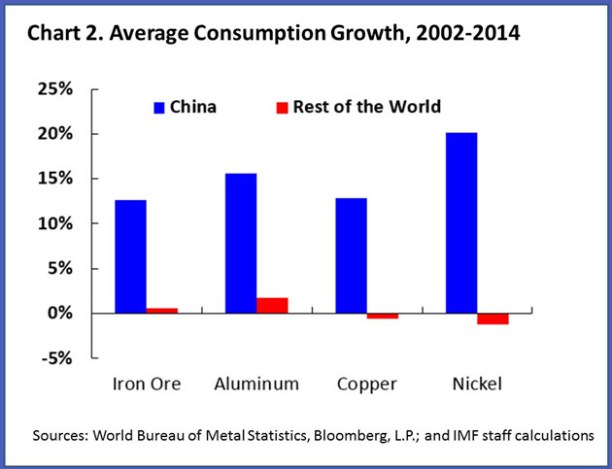 According to EIA data, China accounted for 55% of the increase in global petroleum consumption between 2005 and 2013. IMF economists Arezki and Matsumoto note that China now accounts for about half of global consumption of iron ore, aluminium, copper, and nickel.